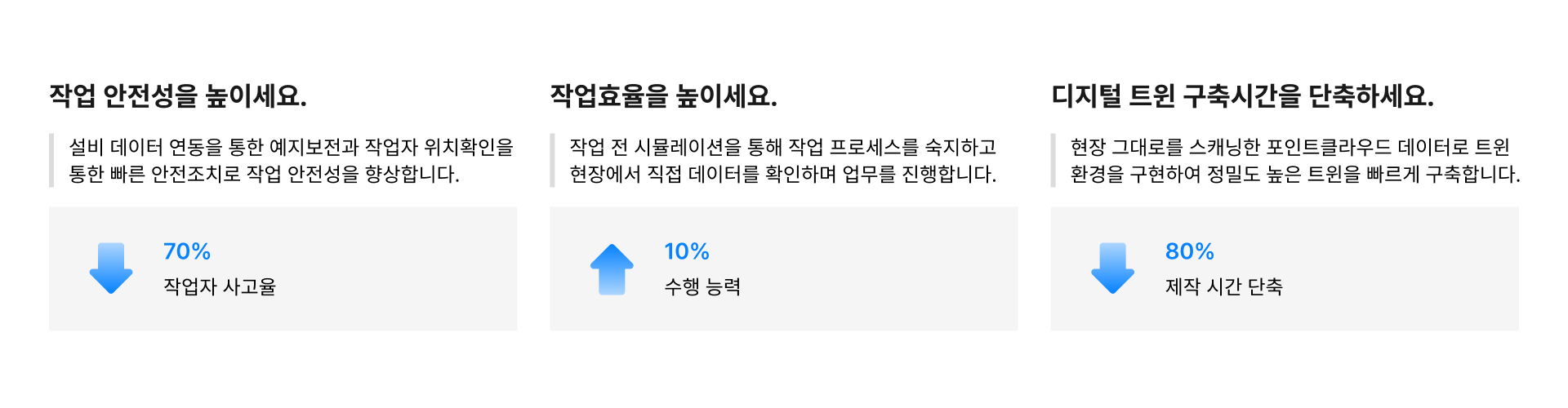 포인트 클라우드 기술을 사용하면 기존 3D 모델링보다 더 빠르고 정확하게 디지털 트윈 환경을 구축할 수 있습니다.